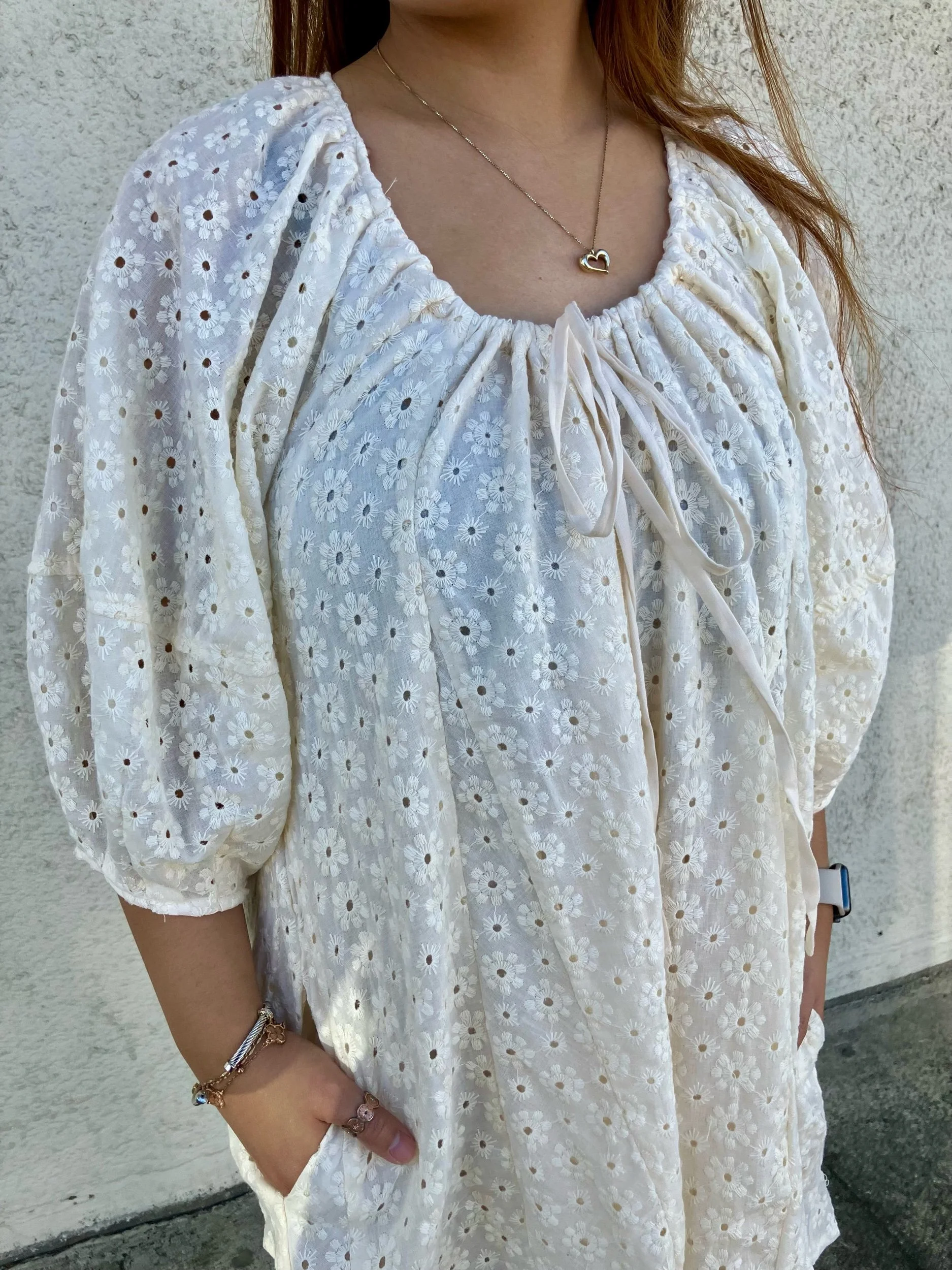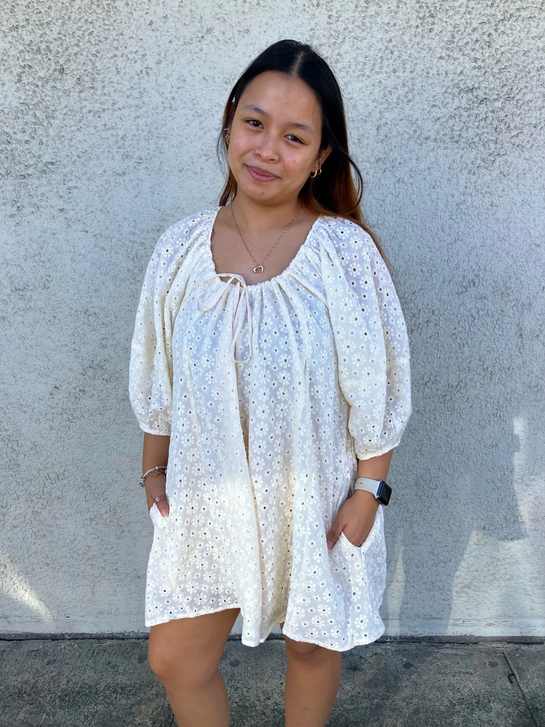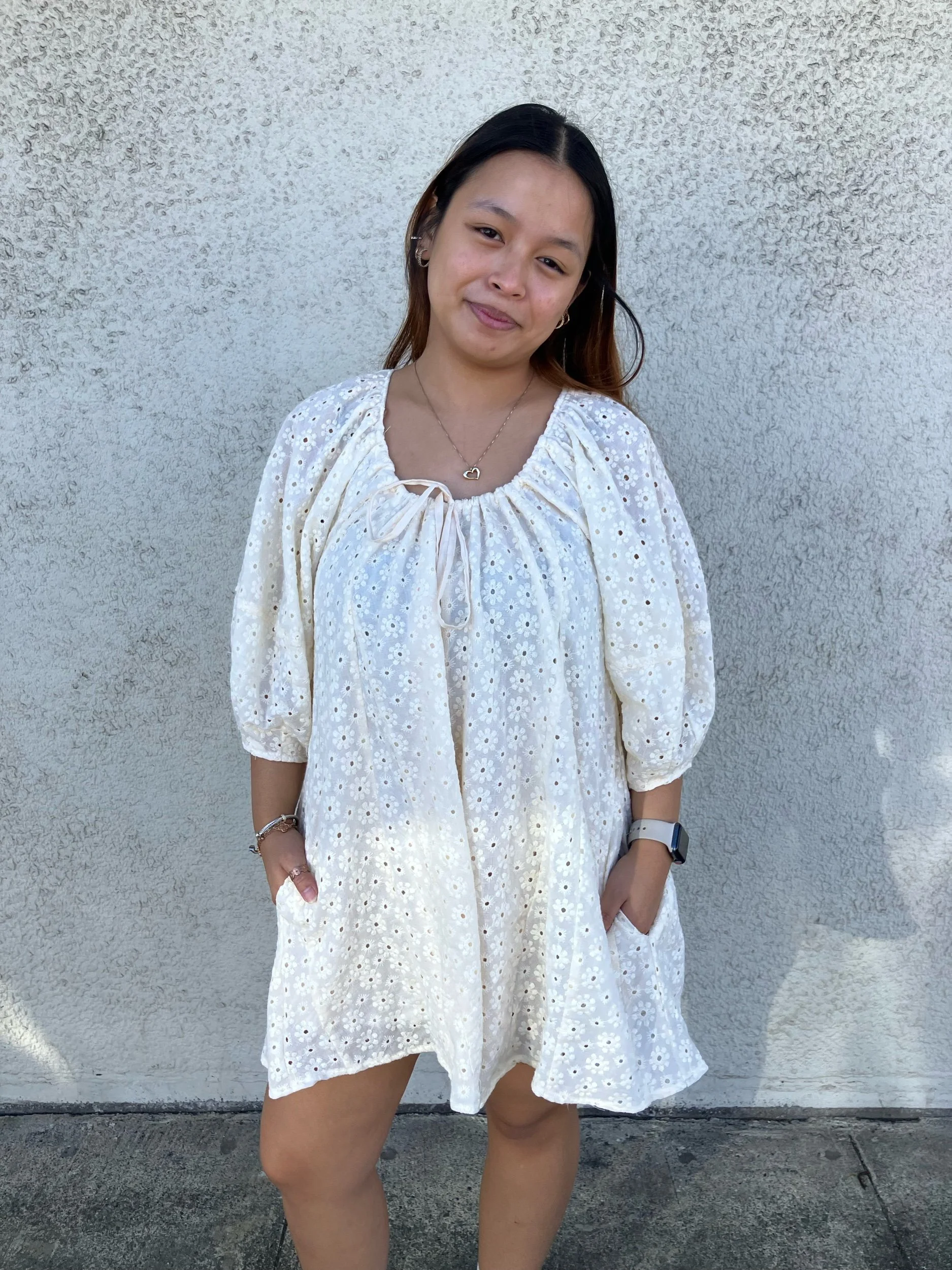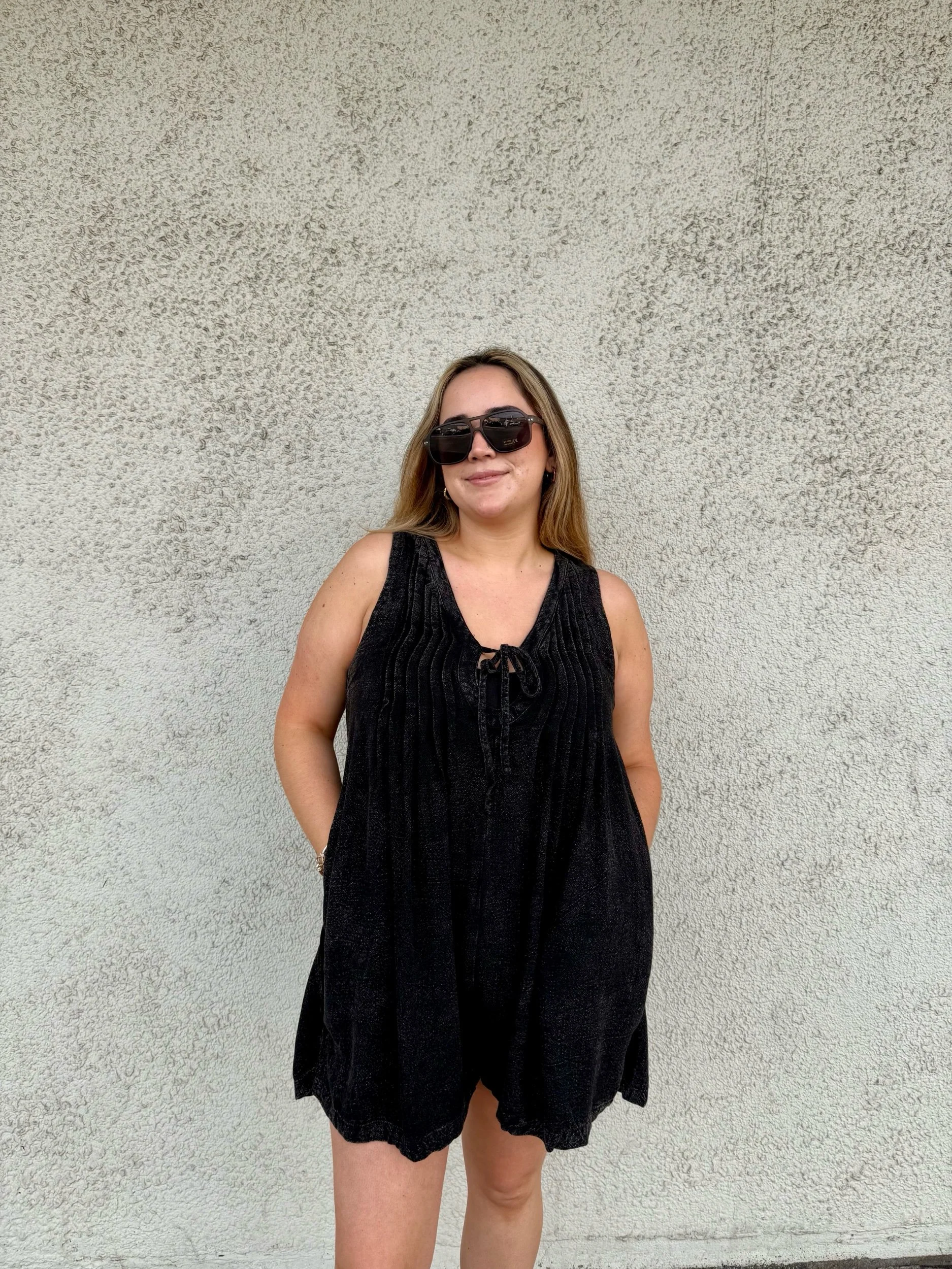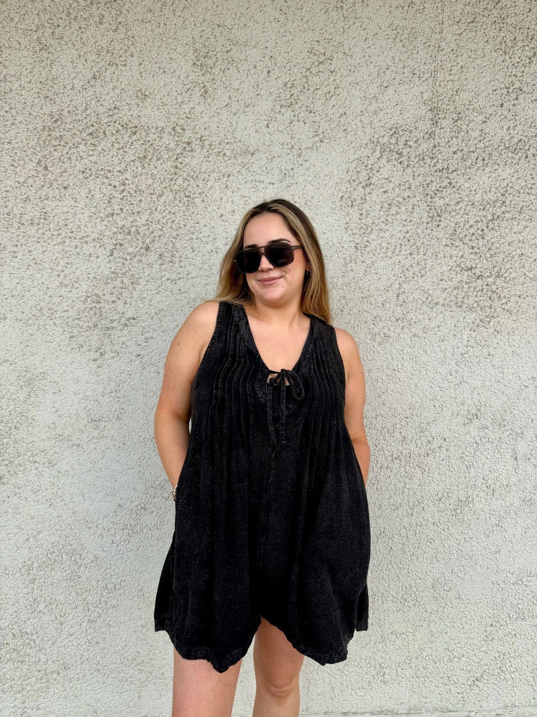 A wide leg romper with a flowy fit to it. A elegant floral detail throughout with a tie front detailing. A button closure back, working pockets.