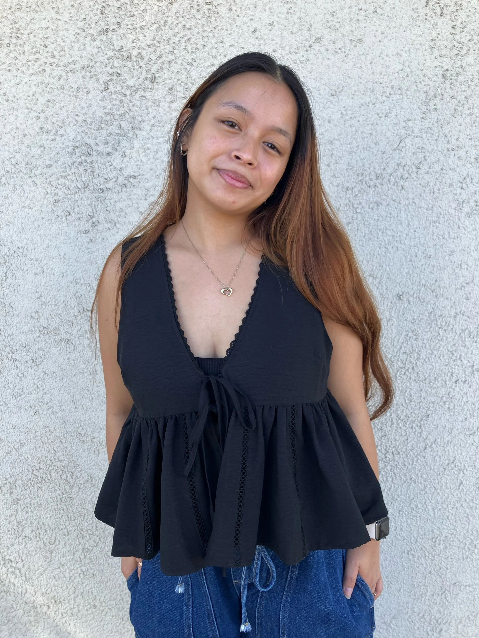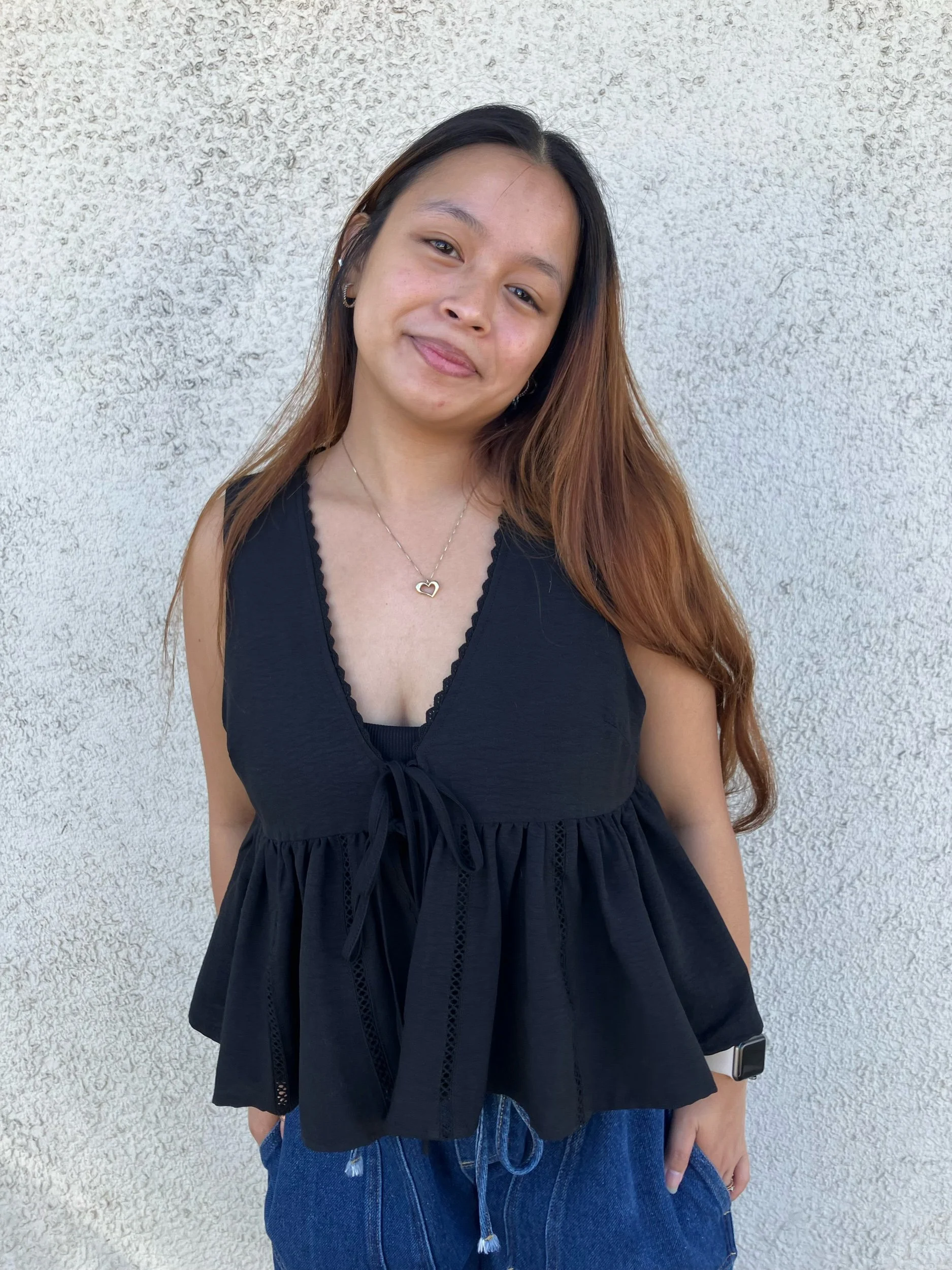 Quick layering with this chic tank. A ribbed detail throughout and an unfinished edge for a semi lettuce cut. This fitted tank is perfect for some layering or wearing alone.