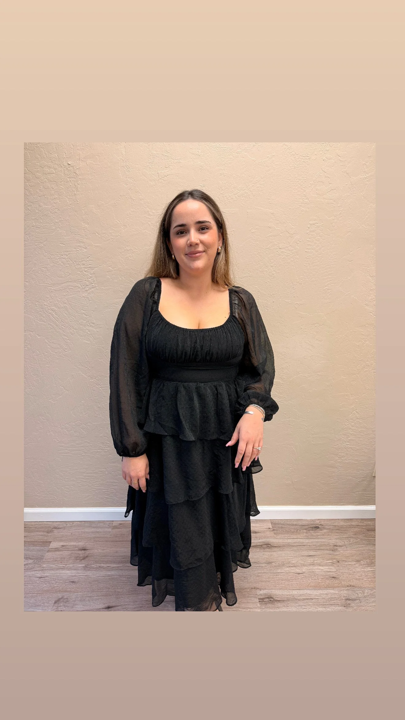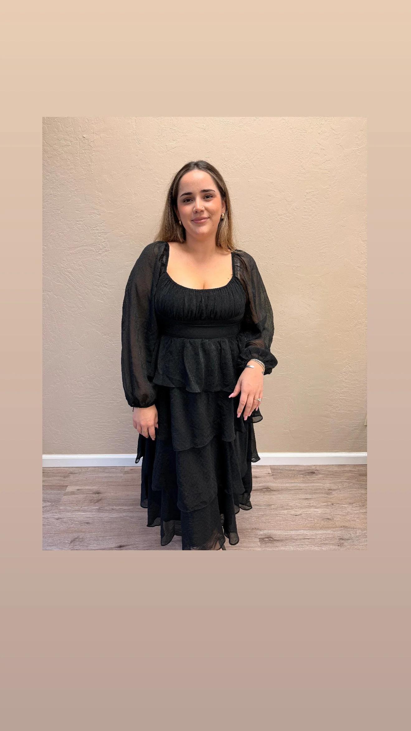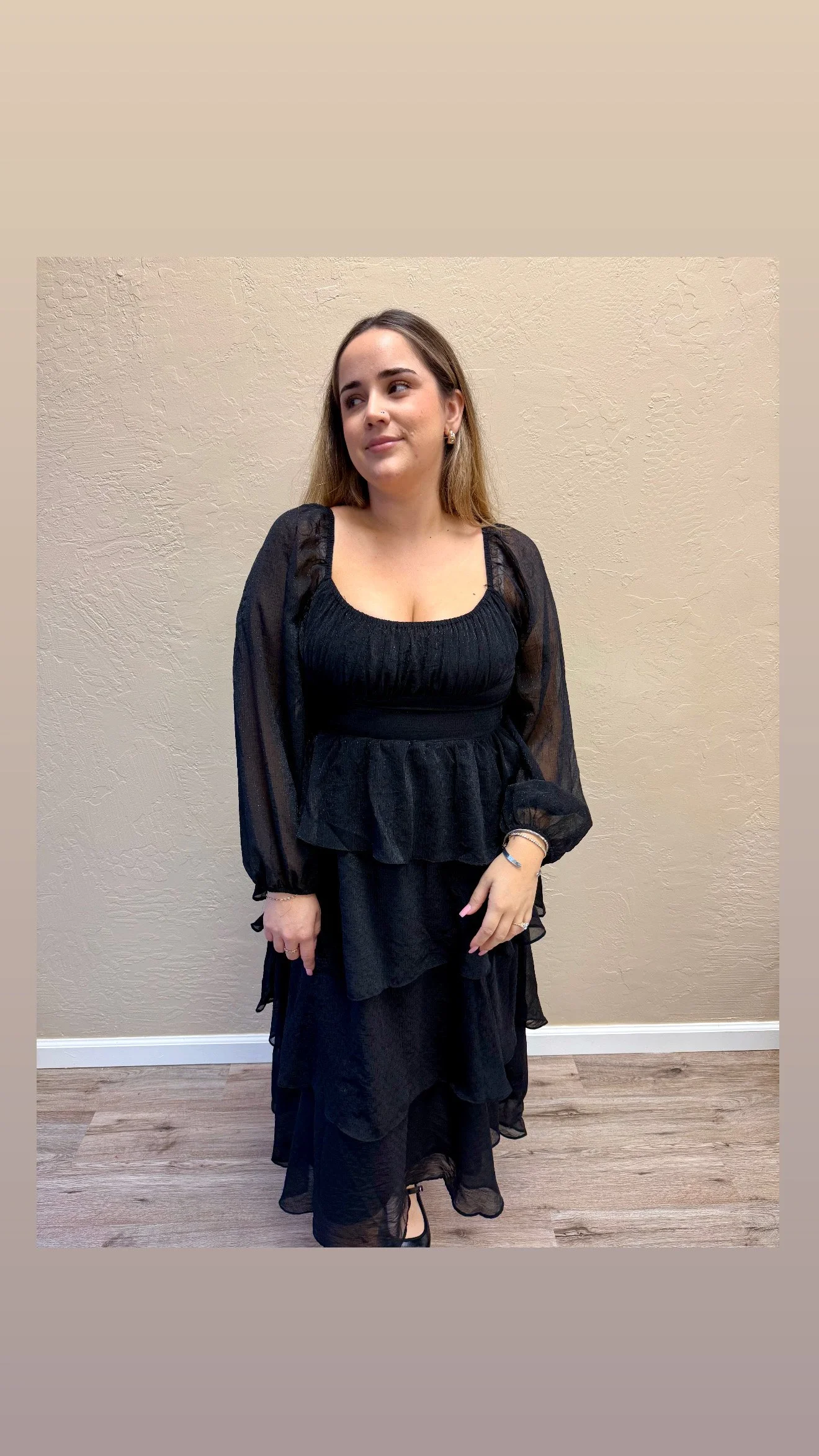 A tiered black chiffon dress with full length sleeves with a mid length, a light shimmer throughout. A fitted bust to flowy four tiered style. Making the dress code easy to hit with this one piece.