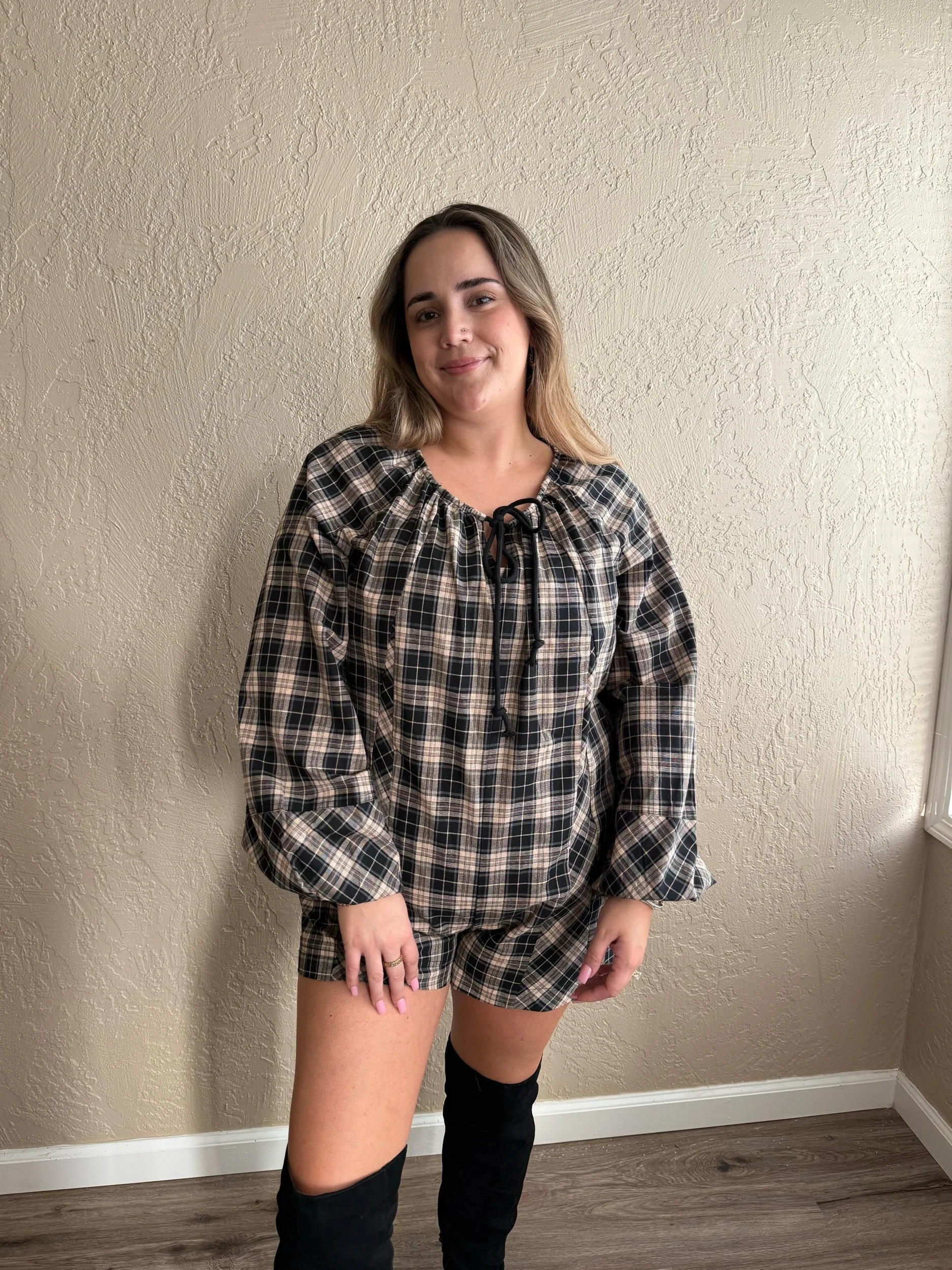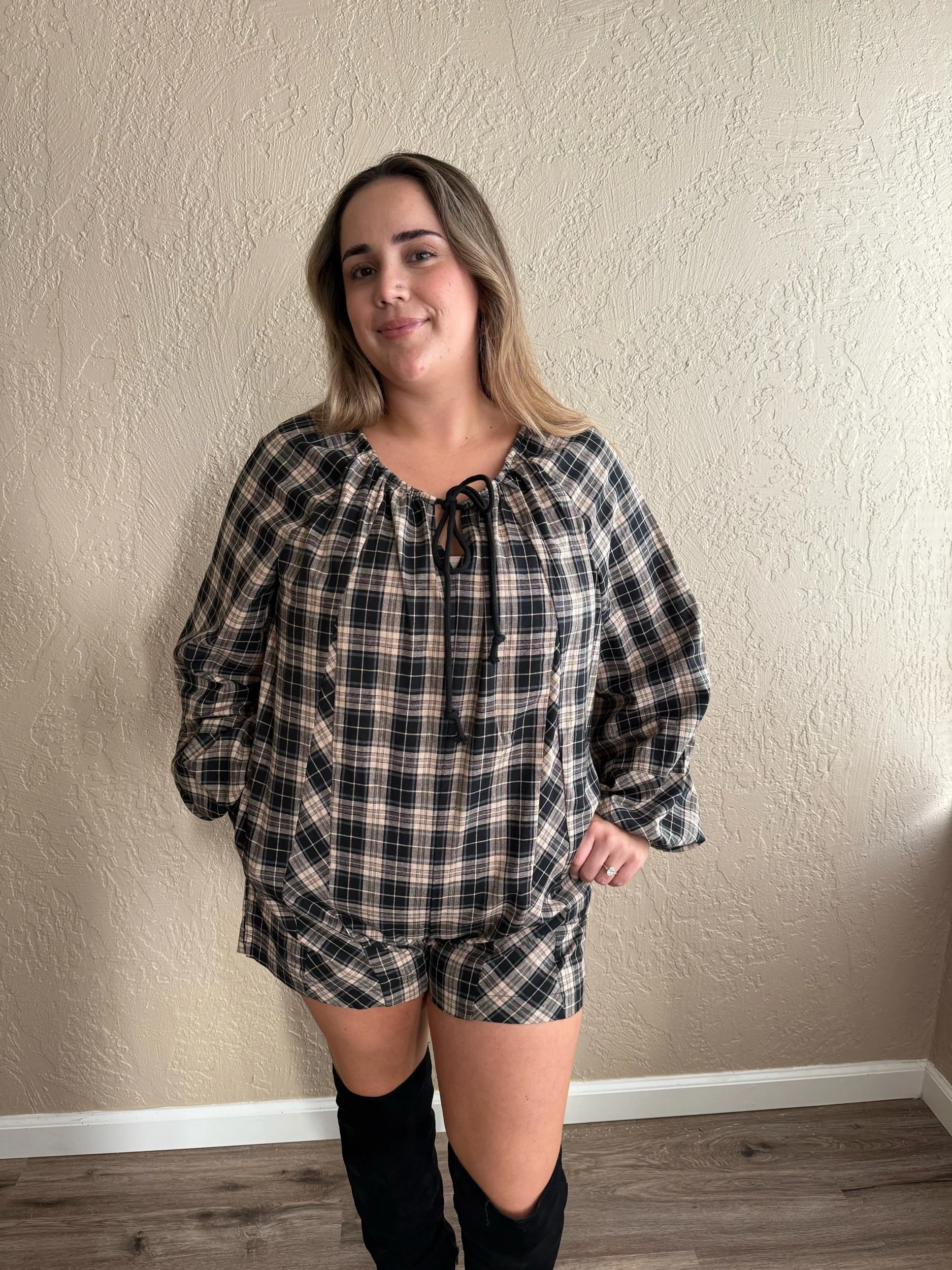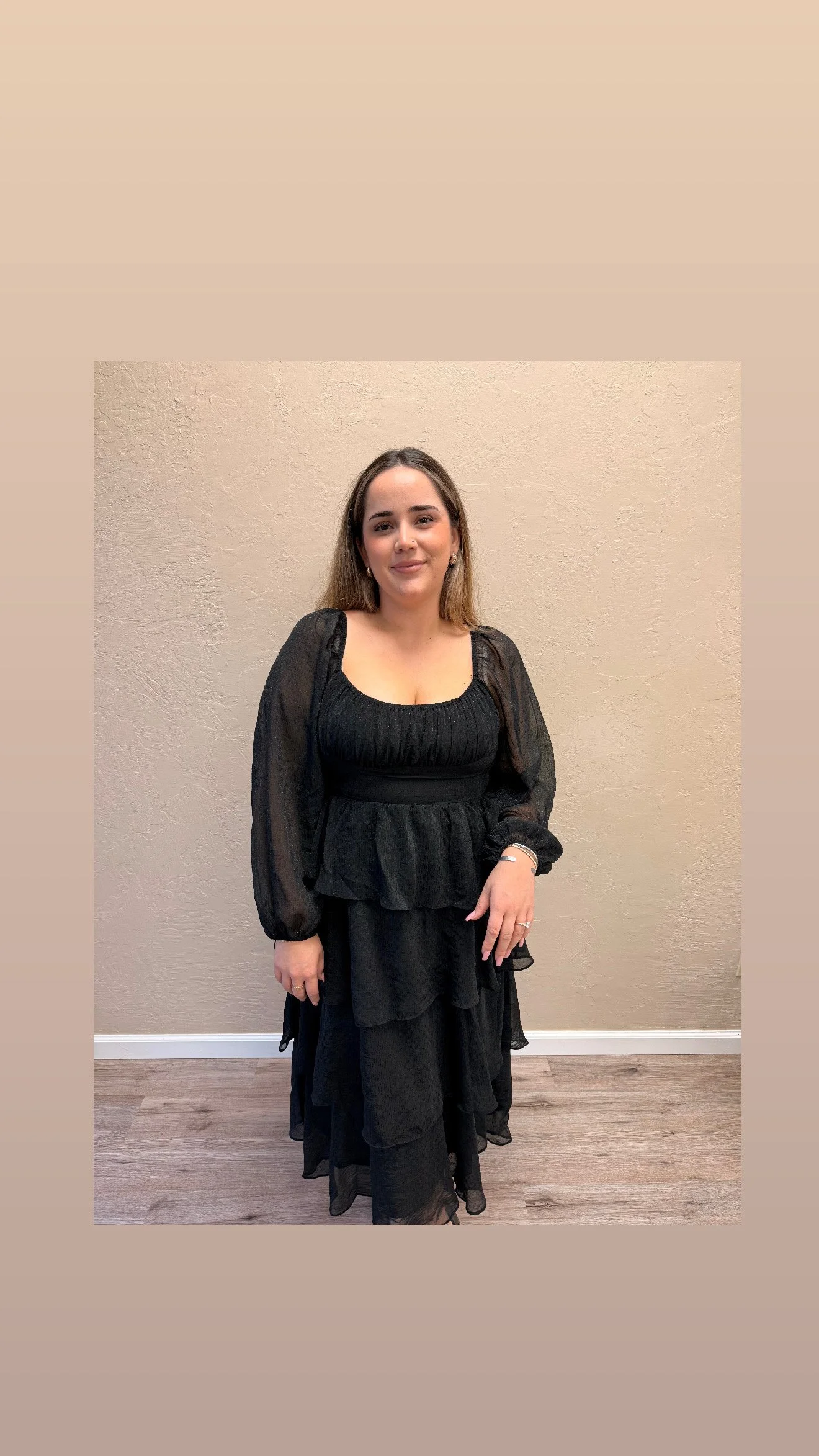 A tiered black chiffon dress with full length sleeves with a mid length, a light shimmer throughout. A fitted bust to flowy four tiered style. Making the dress code easy to hit with this one piece.