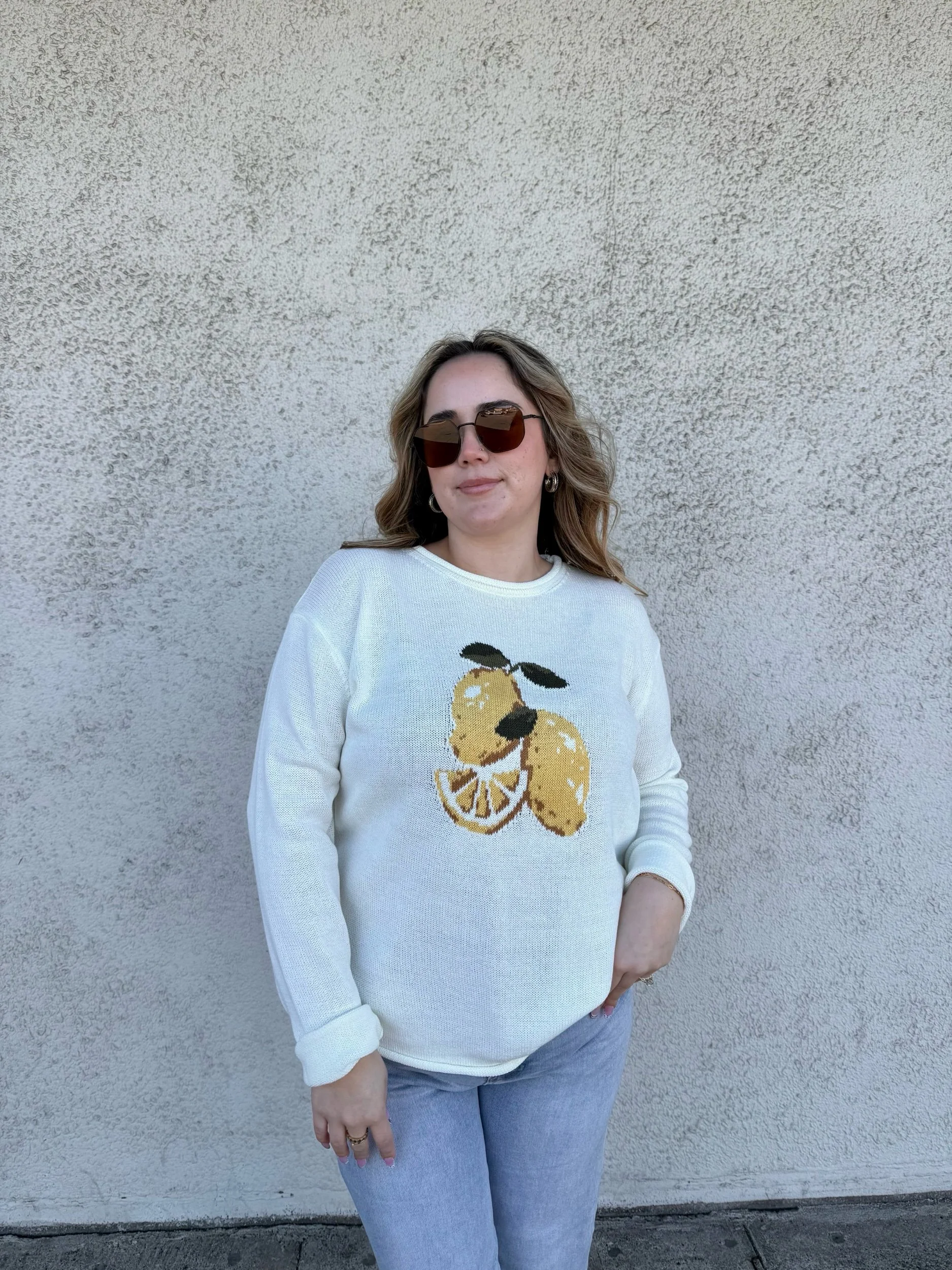 A knitted long sleeve with a little lemon detail! Nothing says spring like a cutie lil knit with a lemon, perfect for all the things to come! Featuring a pre-rolled collar and sleeves with a soft to touch throughout!
