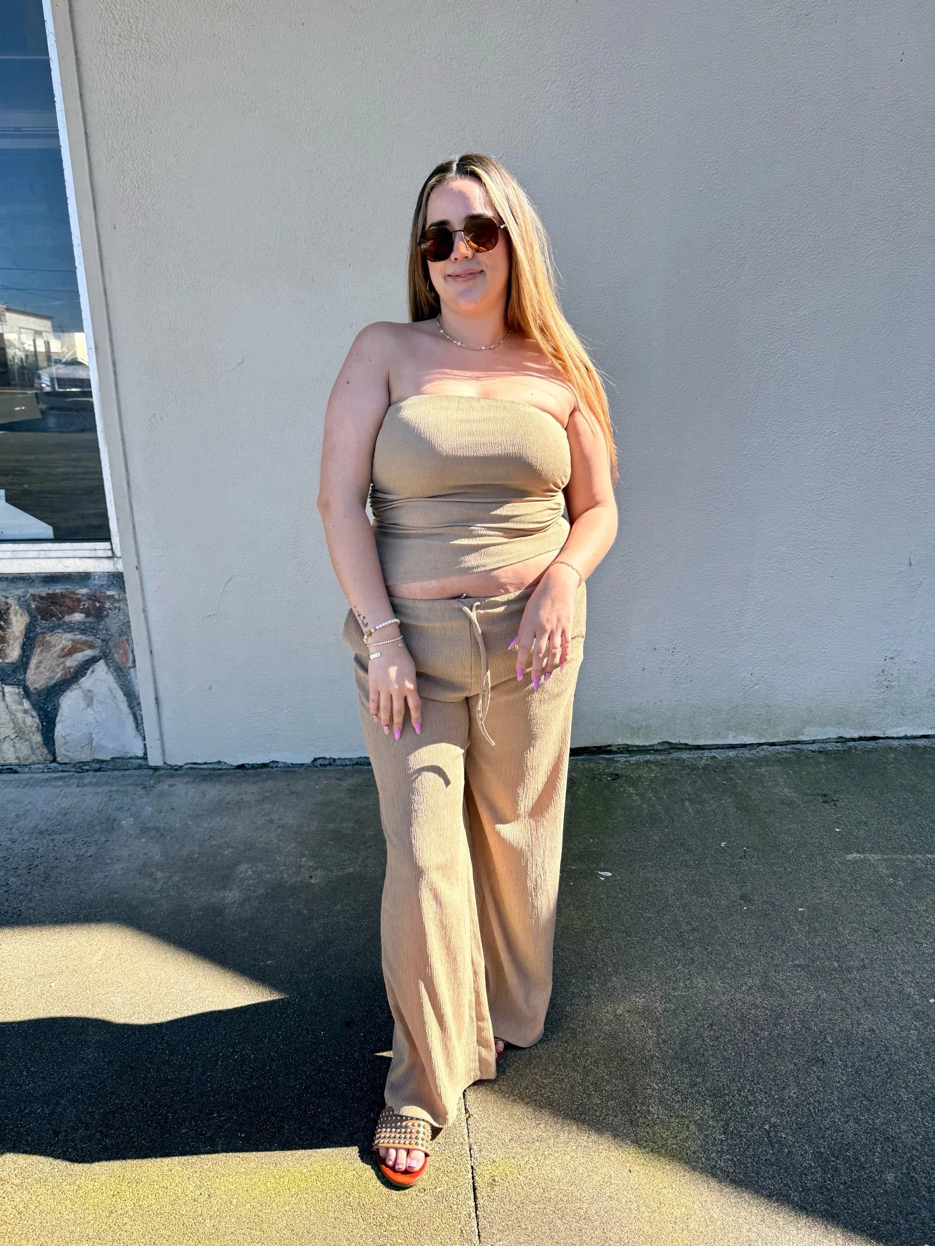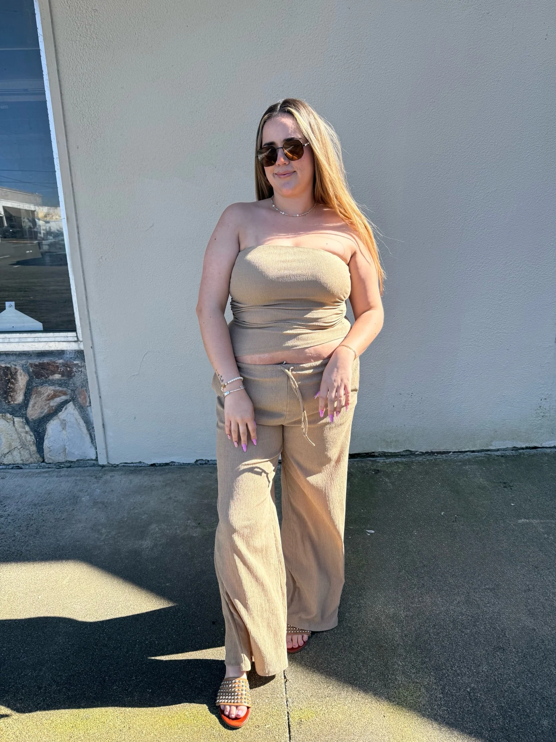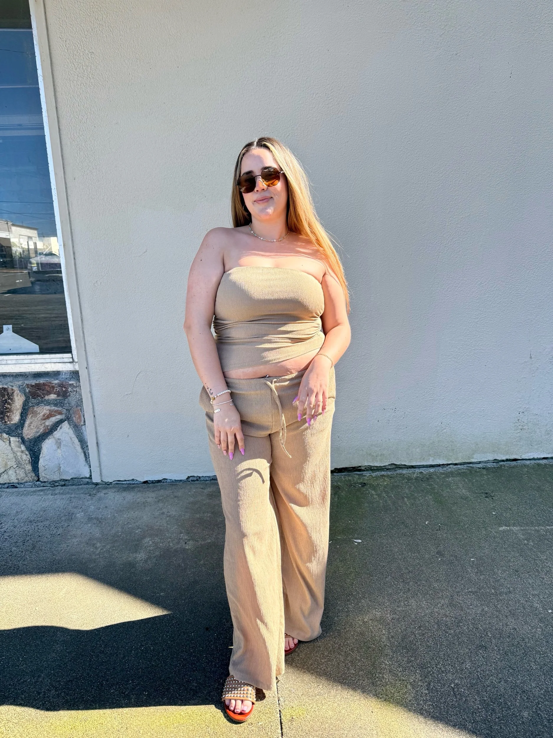 A matching light linen set. A strapless top with an adjacent cut and pull on style linen pants. That after beach dinner outfit for your spring and summer vacations.