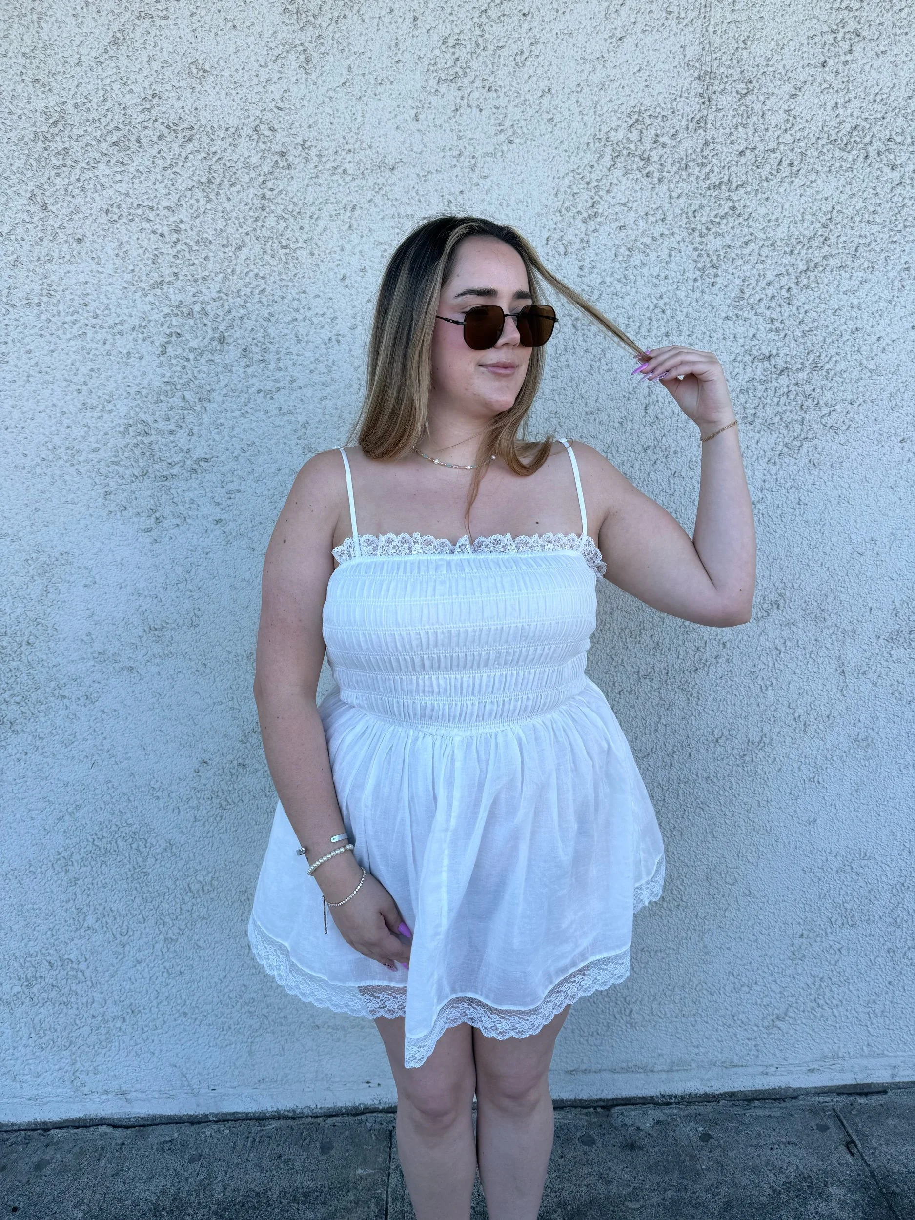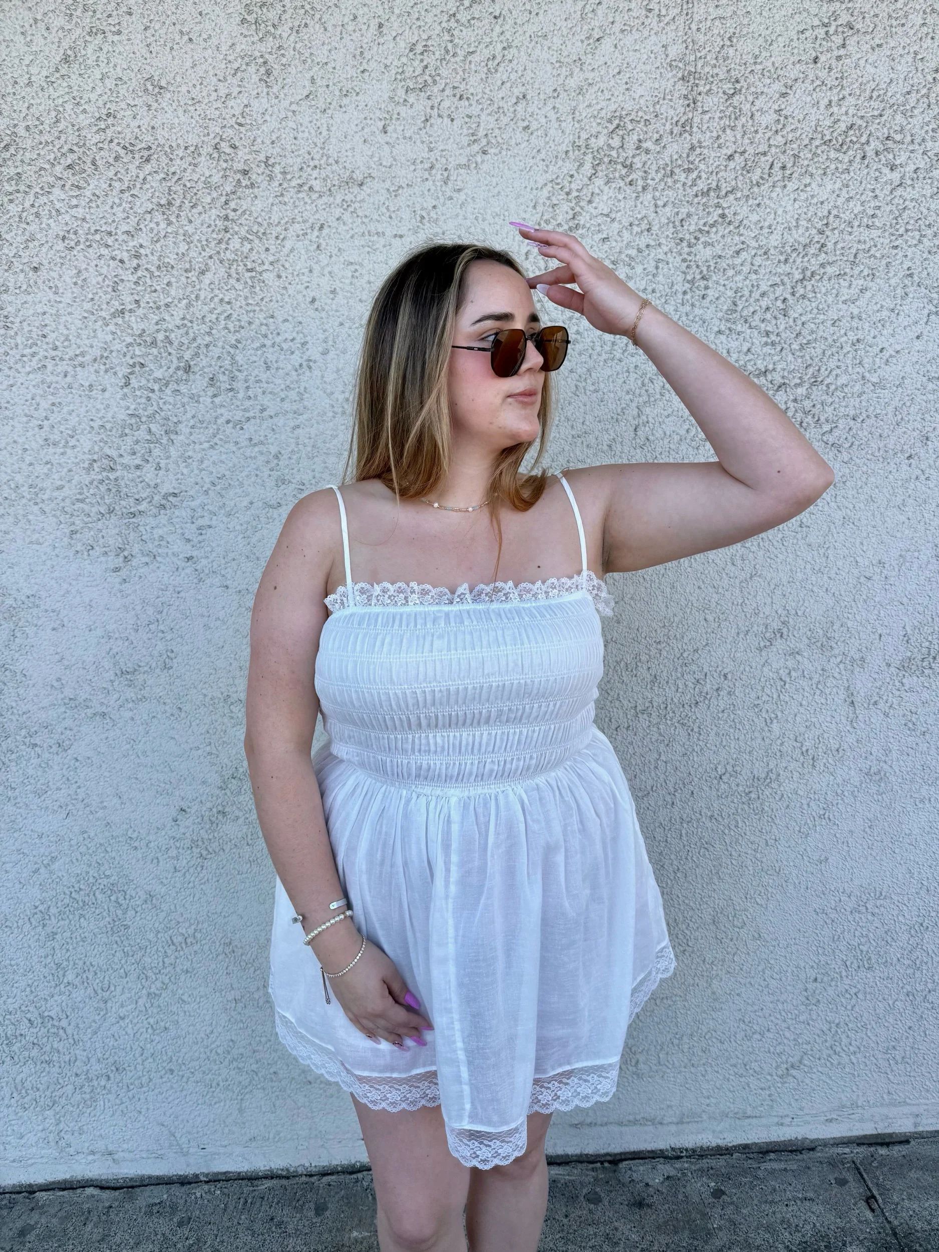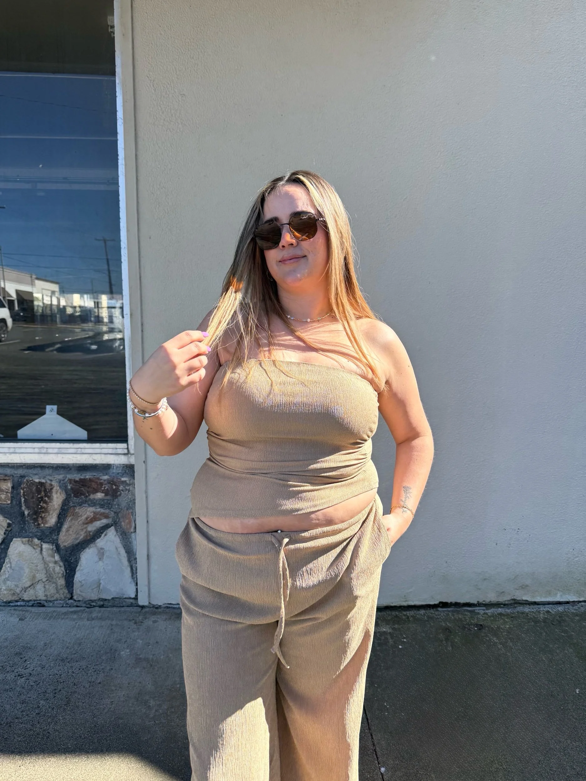 A matching light linen set. A strapless top with an adjacent cut and pull on style linen pants. That after beach dinner outfit for your spring and summer vacations.